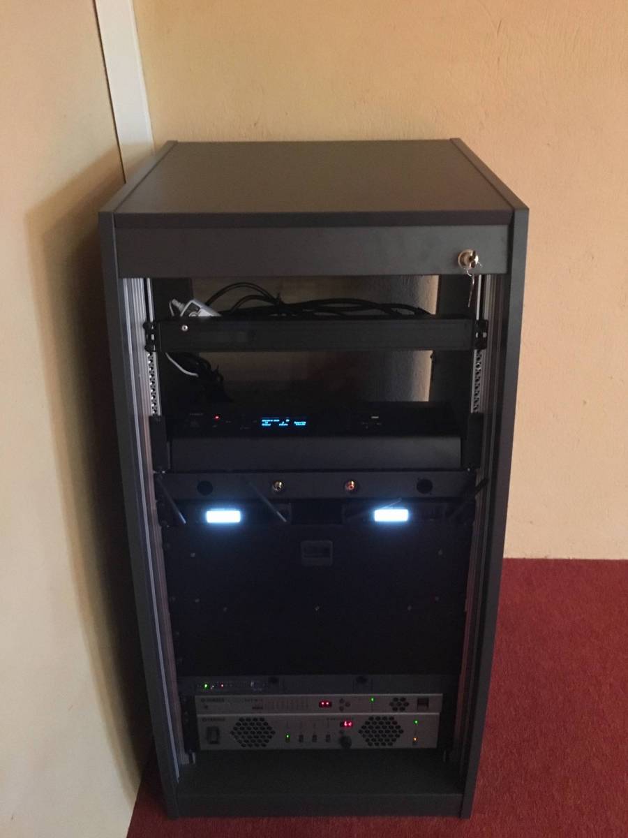 L’ensemble de la régie a été placé dans une rack sur roulettes disponible dans un angle de la salle.