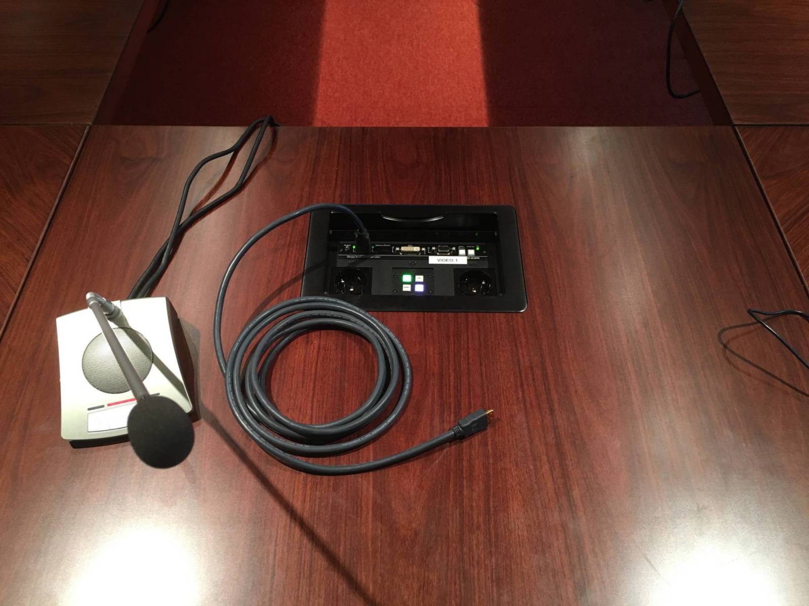 Des modules vidéo ont été intégrés dans plusieurs tables afin de pouvoir brancher très facilement un ordinateur ou une prise de son.